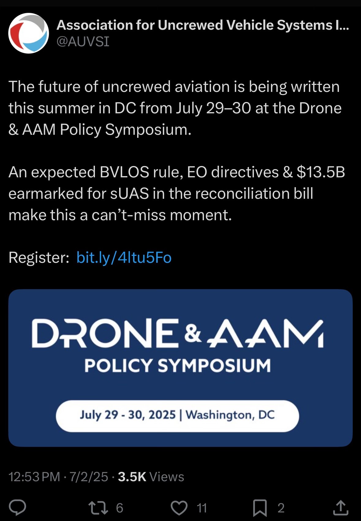 "The future of uncrewed aviation is being written this summer in D.C.," AUVSI posted on July 2, promoting the Symposium.