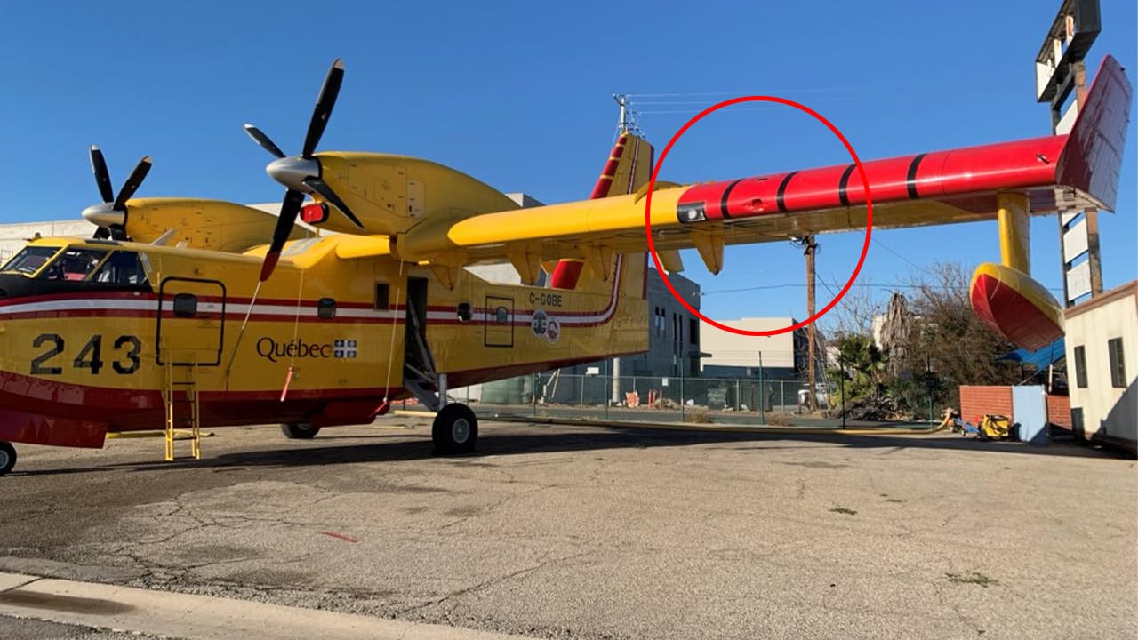 A Super Scooper firefighting aircraft was hit by a drone while battling the Palisades Fire in Los Angeles. The collision, which occurred on January 9, 2025, resulted in a 3x6 inch hole in the plane's wing and caused it to be grounded for several days.