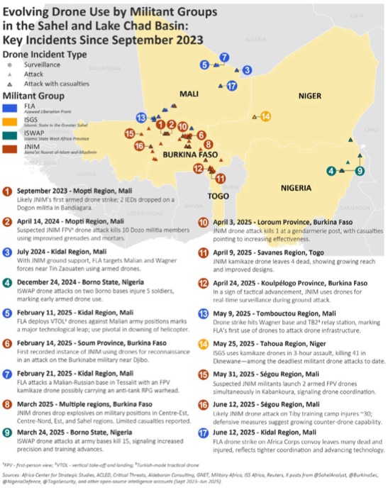 The most recent ACLED data shows a dramatic uptick in JNIM-claimed operations in the second quarter of 2025. Attacks on military outposts in northern Burkina Faso have increased in both frequency and lethality. Drone-assisted strikes are now reported in three distinct regions, with verified images showing explosive payloads and target area destruction.