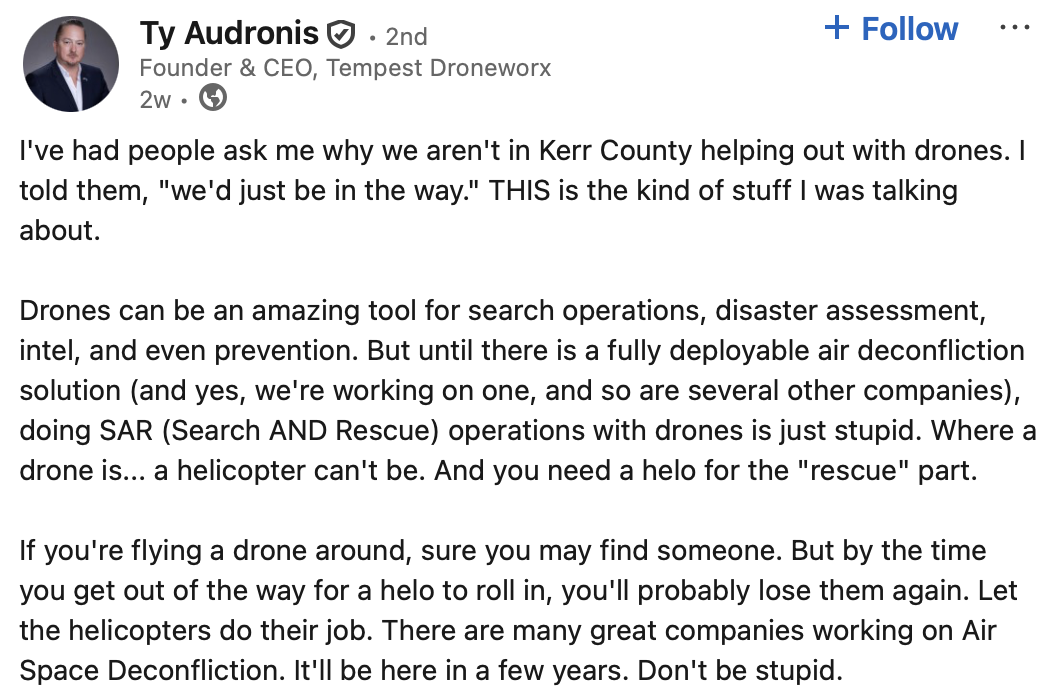 Adrian Doko—posted a warning about unauthorized drone operations, urging users to respect Temporary Flight Restrictions (TFRs). His post was reshared by Michael Robbins, President and CEO of AUVSI, the largest drone industry lobbying group in the United States. A week later, Tom Walker, CEO of DroneUp, cited the Kerrville incident in a LinkedIn post as he prepared to testify before Congress on the risks posed by uncrewed systems to critical infrastructure. He called the incident “tragic,” “entirely preventable,” and “a painful reminder of what’s at stake.”